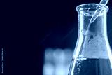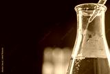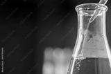 Close-up of a graduated conical flask with a red liquid being added from a dropper.
