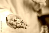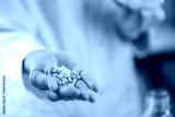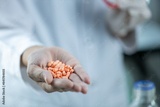 Scientist holding a handful of orange pills in the palm of their hand