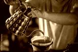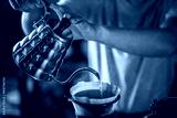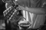 drip coffee, Barista making drip coffee by pouring spills hot water on coffee ground with prepare filter from copper pot to glass transparent chrome drip maker on wooden table in cafe shop