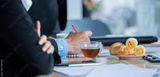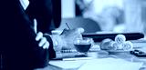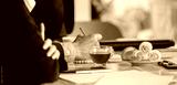 A business meeting with a cup of tea and croissants on the table.