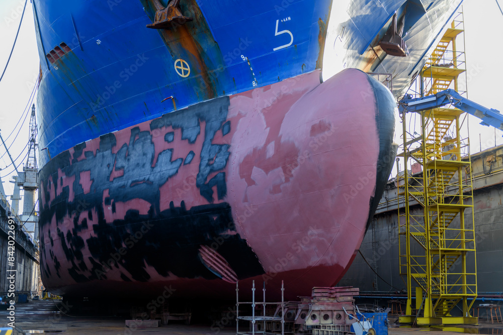 Cargo vessel in dry dock on ship repairing yard. Bulbous bow.
