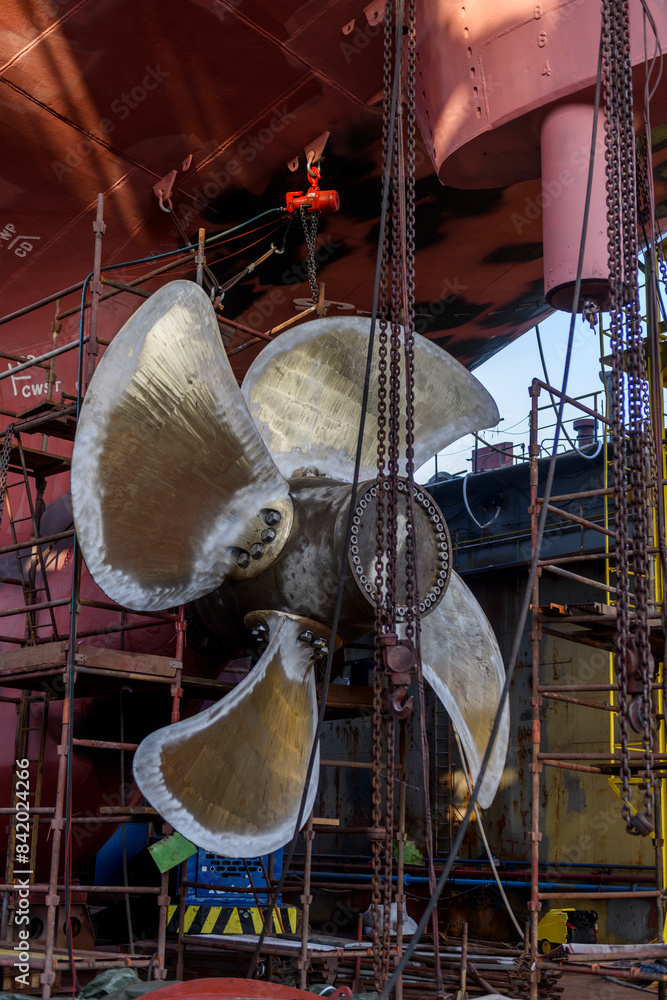 Cargo vessel in dry dock on ship repairing yard. Variable pitch propeller and rudder. Welder working on ship repairing yard.