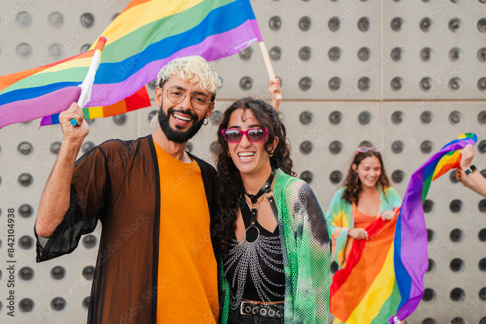 Gay young man and lesbian woman celebrating the lgbt pride with their friends, waving the rainbow flag and havin fun together. Real diverse people claim for their sexual rights at equality party