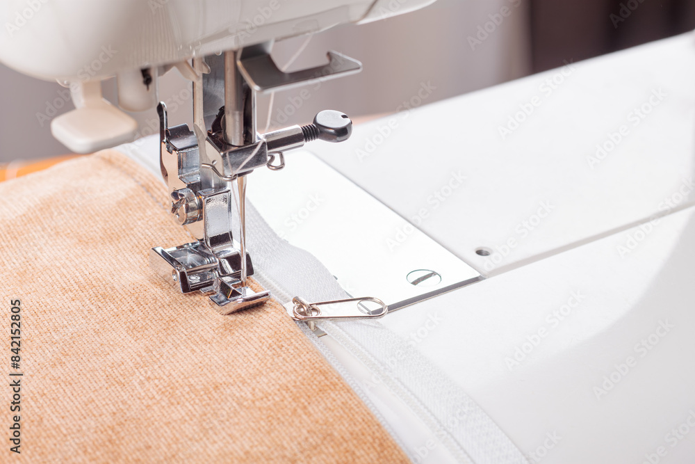 Modern sewing machine special presser foot with beige corduroy fabric and thread, closeup. Sewing process of sewing on a zipper. Business, hobby, handmade, zero waste, recycling, repair concept.