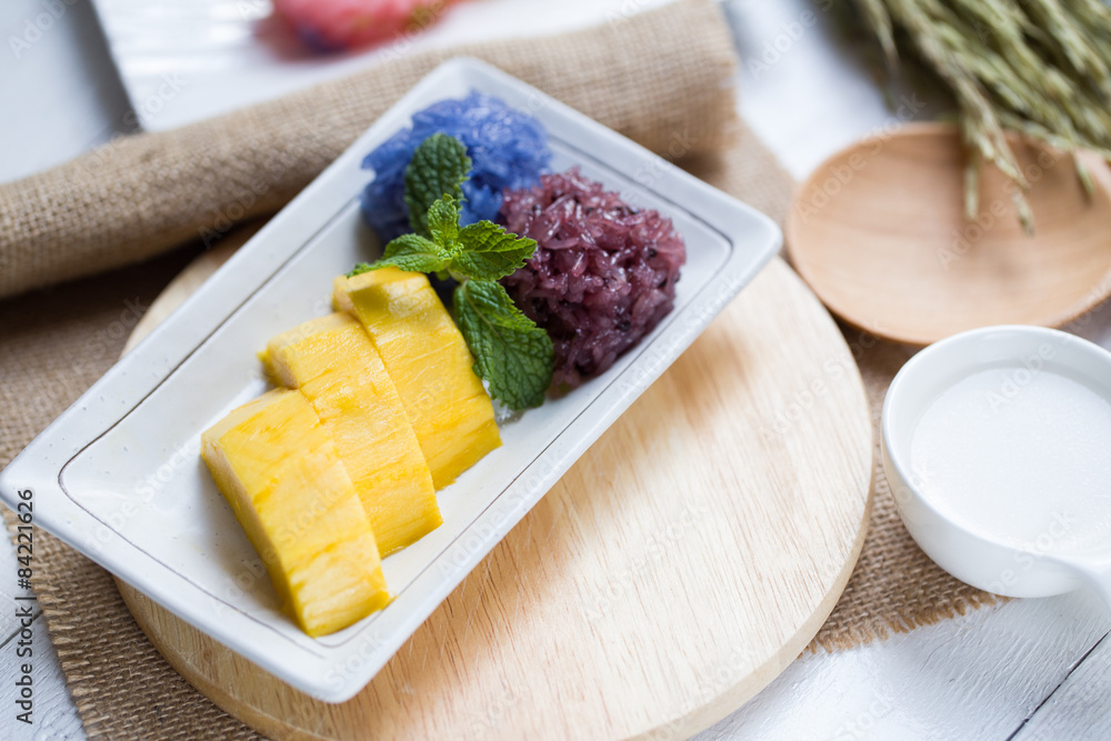 Thai style tropical dessert, sticky rice served with mango