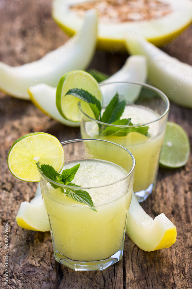 Melon smoothies with slices of melon on the wooden table