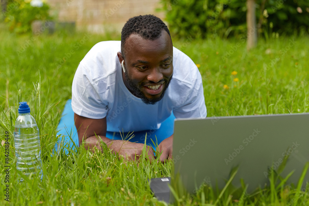 Happy young adult man in the park having online training. Healthy lifestyle.