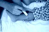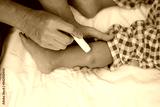 mother applying antiallergic cream on red spot at baby leg after red bite of mosquito