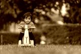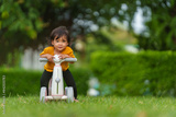 happy baby toddler girl rides plastic motorcycle toy in the park