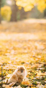 Funny Young Red Puppy Pomeranian Spitz Puppy Dog Posing Outdoor In Autumn Grass