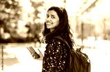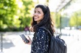 Smiling young woman using her smartphone in the city