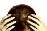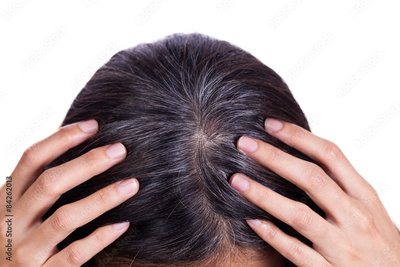 Young woman shows her gray hair roots
