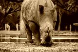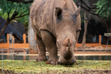 Wild african animals. Portrait of a male bull white Rhino grazing in Etosha National park, Namibia.