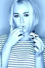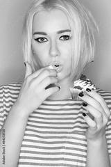 Portrait of a beautiful blonde eating cake with his hands