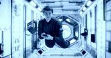 Cheerful Male Astronaut Floating in Zero Gravity Inside a Spaceship. Happy Caucasian Specialist Using Smartphone in Space, Checking News, and Communicating with Family and Friends Online.