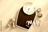 Fitness, diet and weight loss concept, personal scale with measuring tape, green dumbbells and two apples on a wooden floor, high angle view from above, copy space