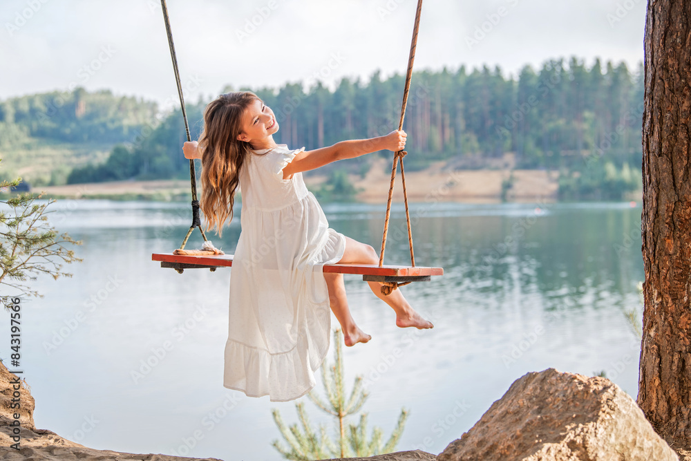 A girl in the forest swinging on a swing. Rope swing on a forest lake. Barefoot girl in a white dress with long hair.