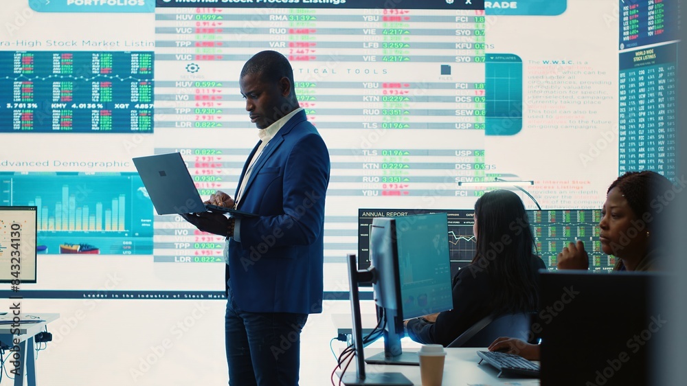 Chief financial officer studying capital funds and revenue data on big screen, verifying annual reports and budget allocation for a project. Looking for ways to increase profit. Camera A.