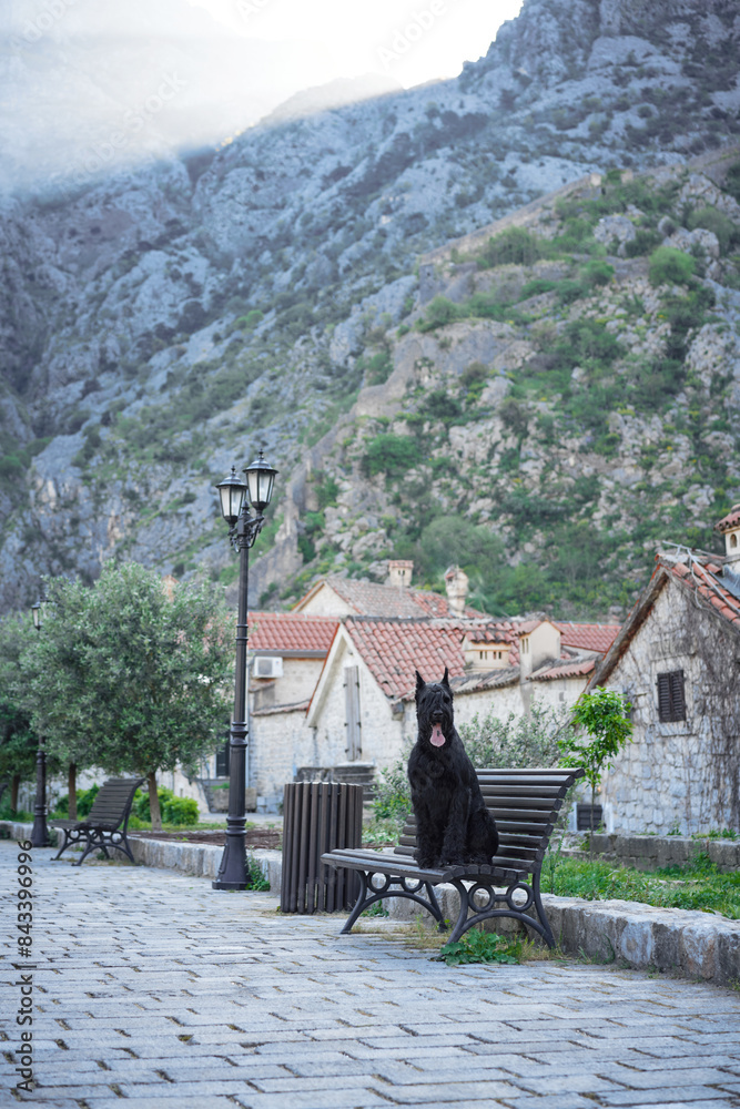 A black Schnauzer dog sits patiently on a street in a historic shopping district, exuding the timeless elegance of the city