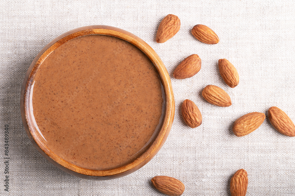 Brown almond butter in a wooden bowl on linen fabric. Smooth food paste made from grinding almonds into nut butter. Puree of nuts of Prunus dulcis with a nutty flavor. A good source of protein.