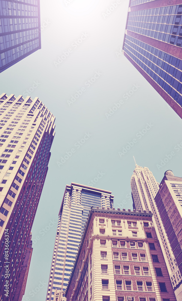 Looking up at New York City skyscrapers against the sun, color toning applied, USA.