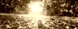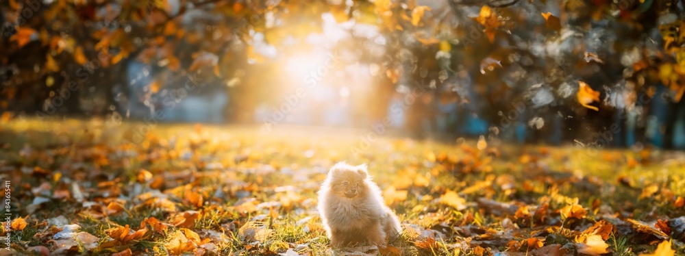 Young Red Puppy Pomeranian Spitz Puppy Dog Sitting Outdoor In Autumn Grass