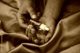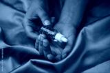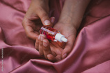Transparent glass pipette bottle with red serum for face, body care in the hands on silky pink textile. Female beauty treatment. Beautician product