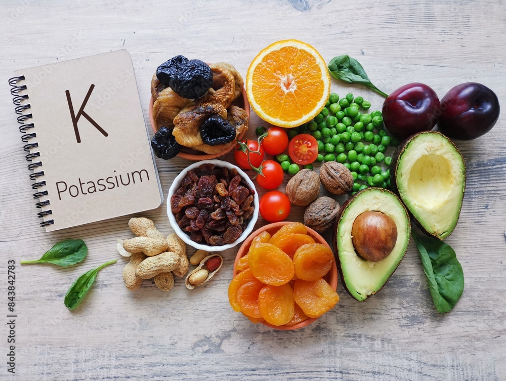 Potassium rich foods. High potassium foods with chemical symbol K. Natural dietary sources of potassium include dried apricot, orange, prunes, spinach, nuts, peanuts, raisins, peas, avocado, tomatoes.