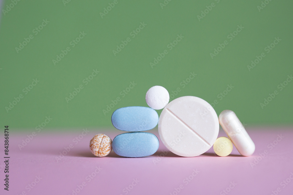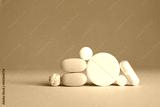Pills on table, Suitable for healthcare, medication, and pharmaceutical topics, blending medical imagery with artistic design. minimalist