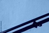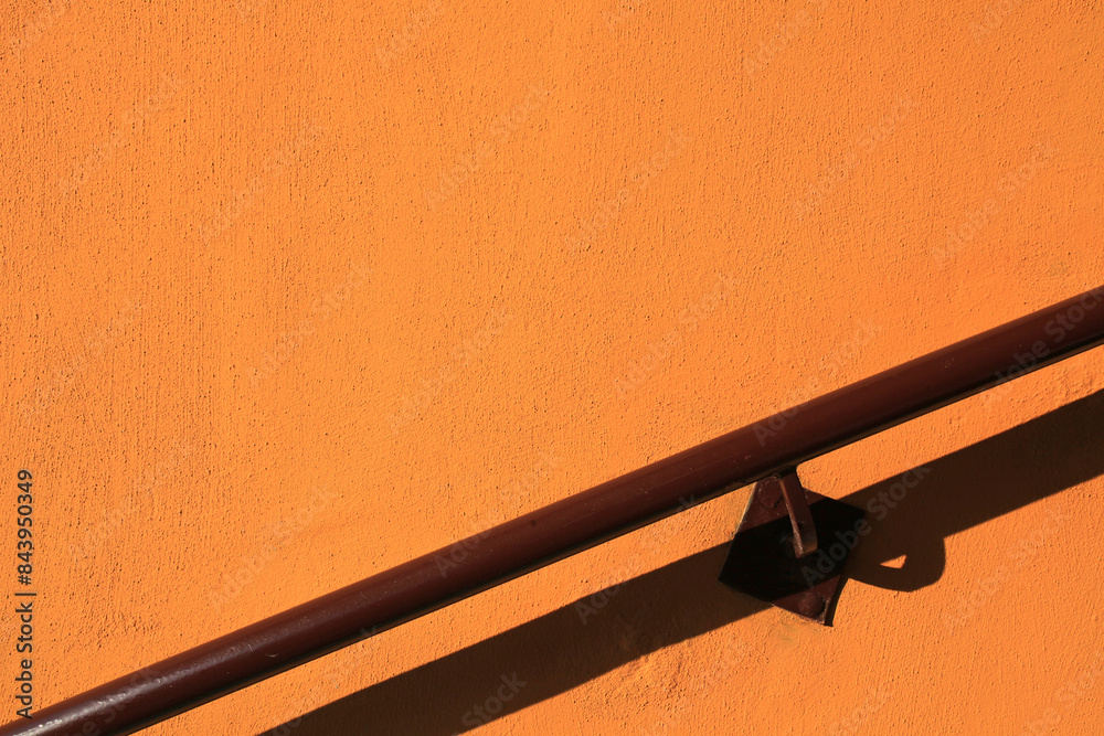 Orange wall, texture, background. Decor of contrasting orange textured coating with metal handrail. Structural plaster, rough, uneven surface in bright orange color. Modern exterior cladding