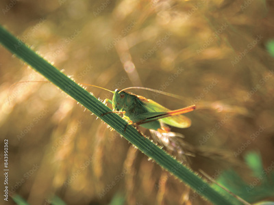 Beautiful green grasshopper on a blade of grass stem close-up. Insect in sun backlight. Fauna of Ukraine in the Middle Forest belts of the globe. Large grasshopper view in the light of evening sun