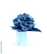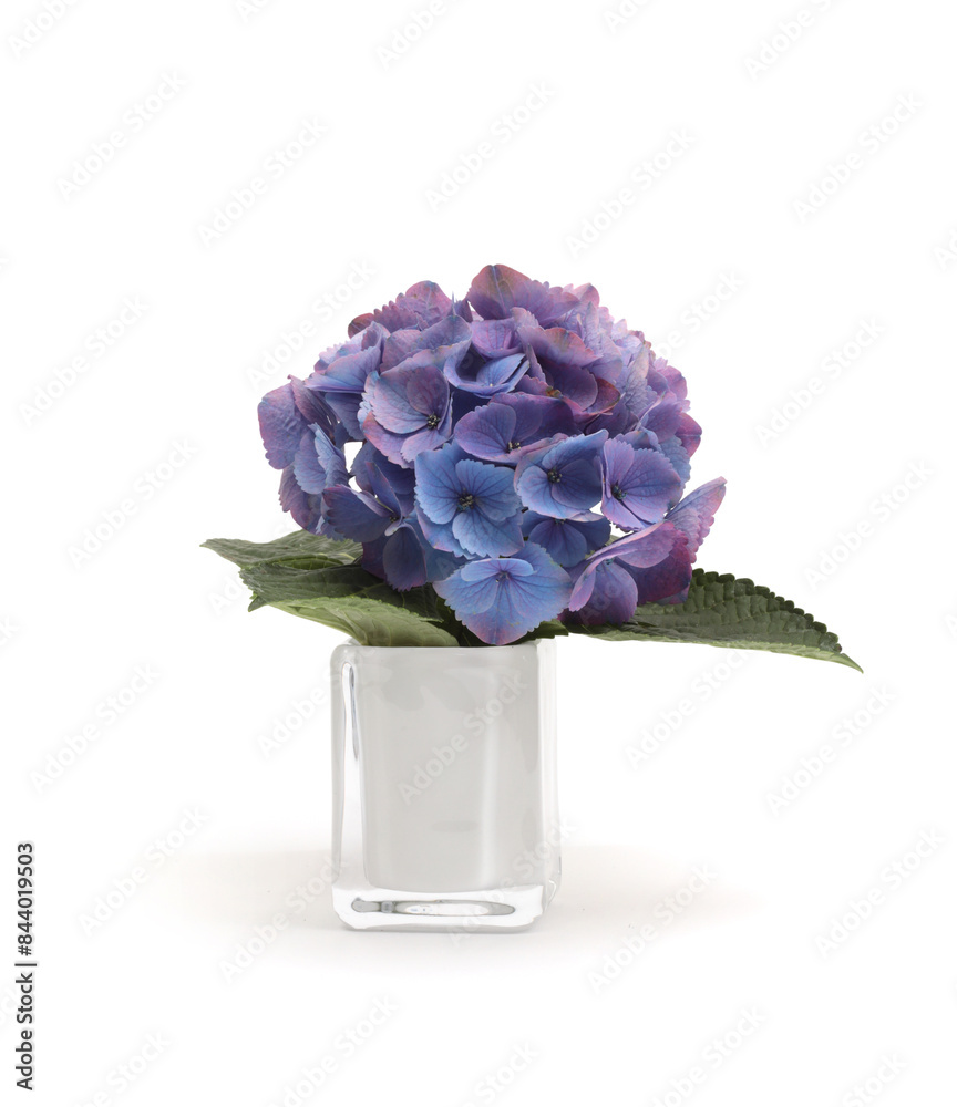 Blue violet lilac hydrangea flower in vase on white. Minimalist still life.