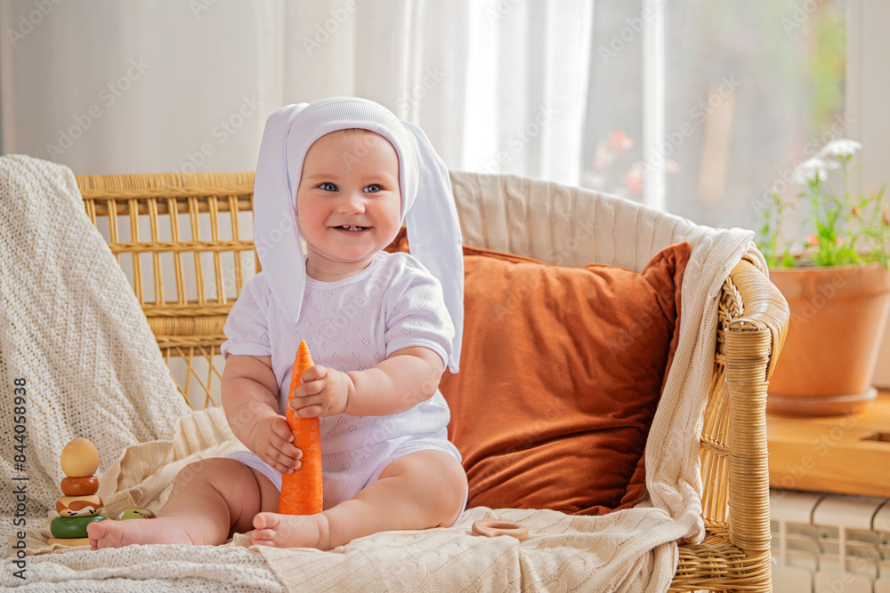 A child in a white cap with bunny ears sits on the sofa with a carrot in his hand.