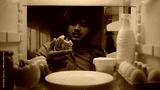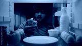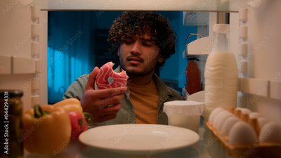 Point of view POV from inside refrigerator hungry Indian man Arabian guy male at night kitchen open fridge want eat take bitten sweet donut smiling condemn bakery unhealthy food nutrition overeating