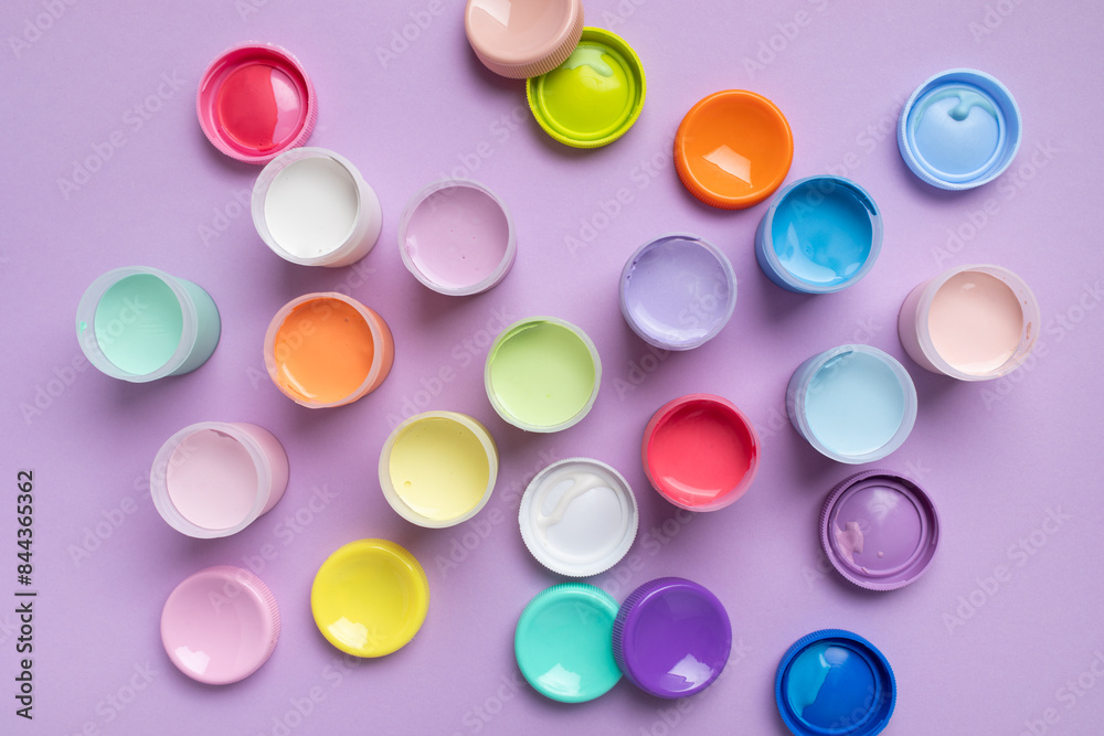 Pastel colors gouache in jars on table top view. Creative hobby painting concept.