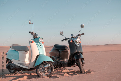 Two Retro scooters at sunset in the golden sand of the Namib Desert