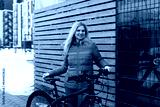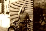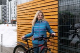 Bike rental concept. Blonde woman took a break while walking with a bicycle