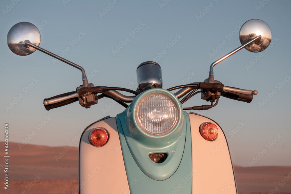 Retro blue scooter at sunset in the golden sand of the Namib Desert