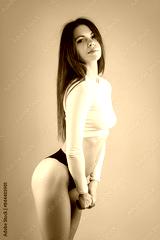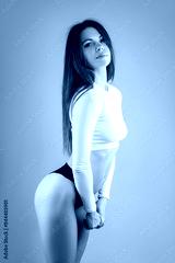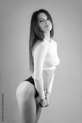 Muscular sexy fitness woman in white long sleeve top on gray background