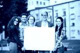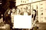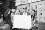 happy teenage students holding white blank board