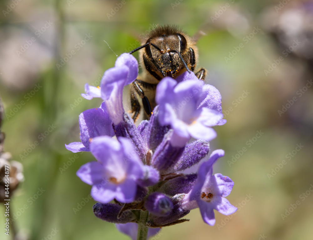 Bee pollinates a lavender flower, macro view.