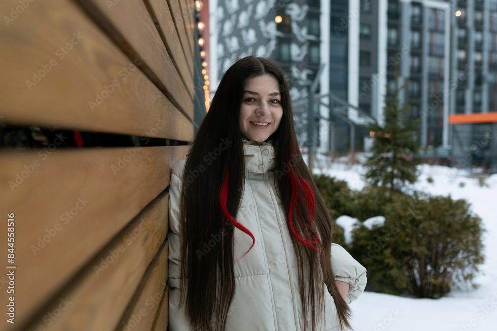 Woman Standing Next to Wooden Wall in Snow
