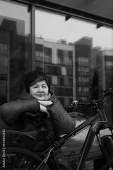Mature European woman goes for a walk with a bicycle in winter