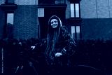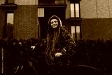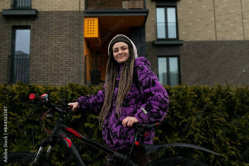 Bicycle rental concept. Young woman with dreadlocks holding a bicycle