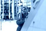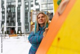 Lifestyle concept. A woman in a blue jacket with a colored strand in her hair walks on the street in winter