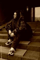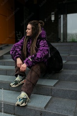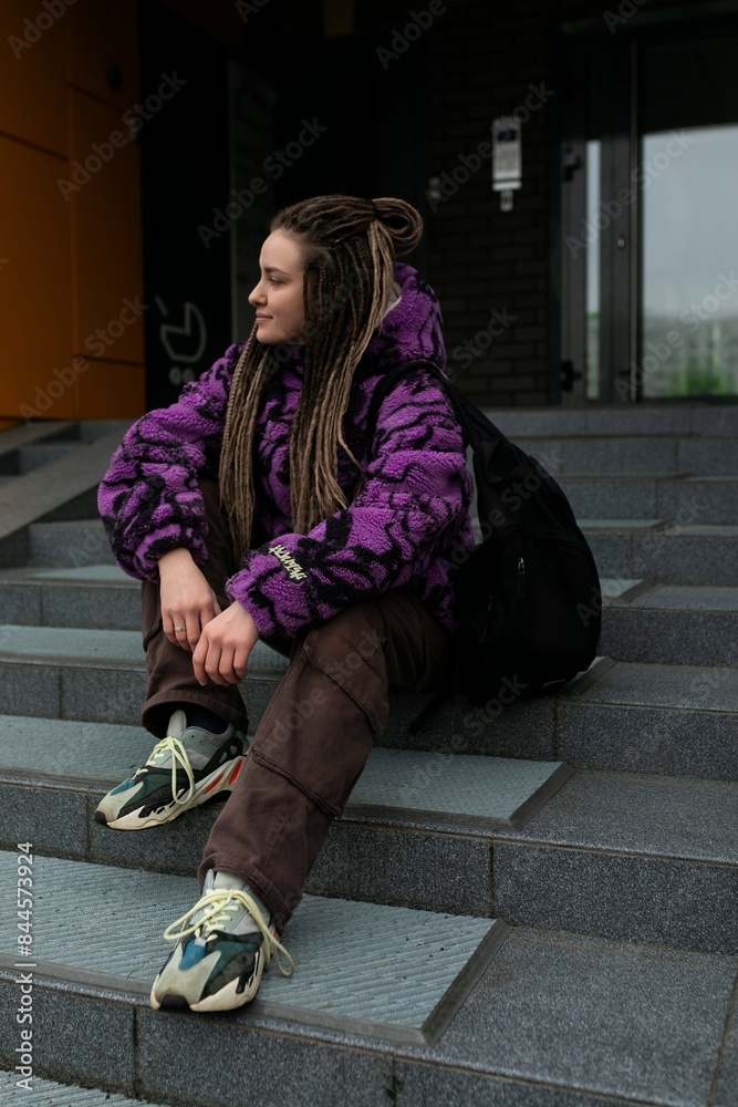 Beautiful young woman with dreadlocks and piercings walks through the city