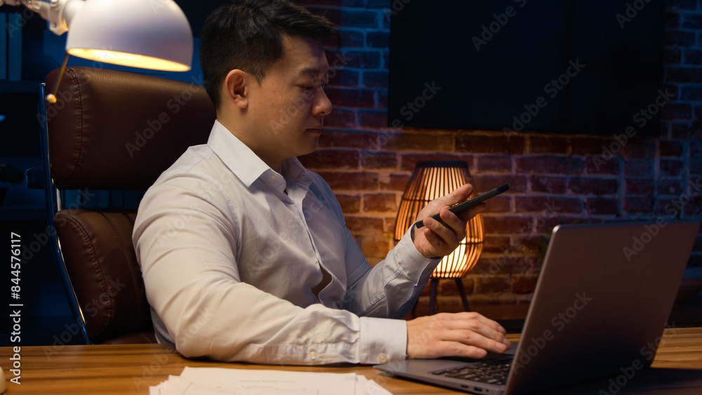 Asian middle-aged male office worker at night evening Korean man businessman executive with laptop working dictate business audio message voicemail on phone answer with vocal AI smartphone technology