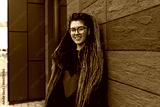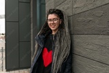 Cute young woman with dreadlocks hairstyle looks informal and unusual