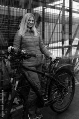 European woman with blond hair went out for a bike ride in winter