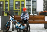 A boy in winter clothes went out for a bike ride